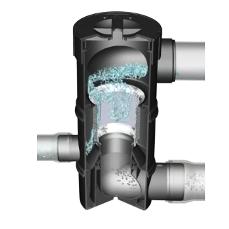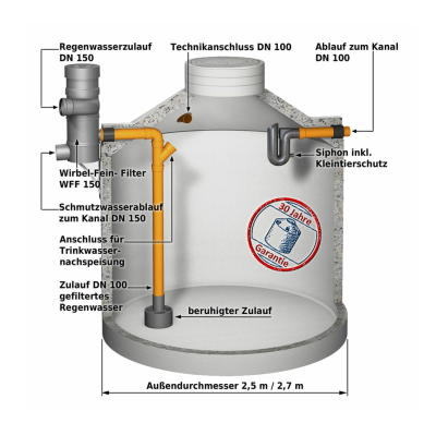 Der Wirbel-Feinfilter WFF 150 wird in der Regel vor der Zisterne als separater Schacht eingebaut. Er filtert das einströmende Regenwasser in gefiltertes Brauchwasser und leitet es seitlich zur Zisterne weiter. Die Verschmutzungen fallen nach unten durch und können somit in den Kanal oder eine Sickerschacht geleitet werden. Sein Filtereinsatz besteht aus feinem Edelstahl-Gewebe mit einer Maschenweite von nur 0,28 mm. So werden Blätter, Moos und sonstige mit geschwemmte Fracht zuverlässig separiert.